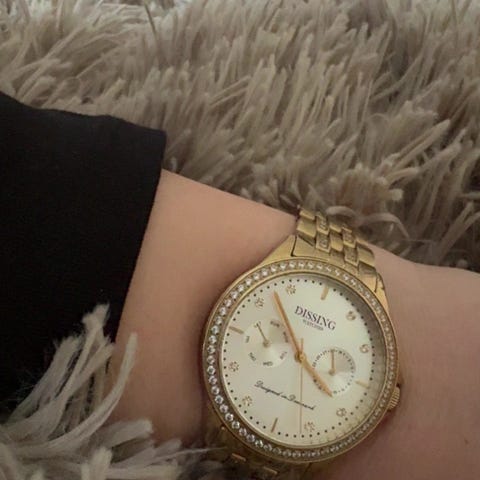Utroligt elegant og smukt dameur. Urets kvartsurværk bliver beskyttet af en urkasse af rødguld farvet ædelstål og hærdet mineralglas. Uret kommer med datoviser og stopursfunktion, og den elegante urskive er pyntet med perlemor. Omkring urkassen har uret flotte og funklende similisten.