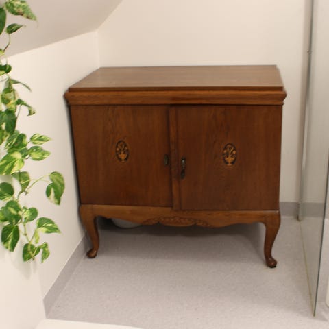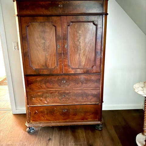 Antikt træskab med én skuffe og én låge. Skabet har en slidt overflade med patina, der viser alder og brug. Velegnet til opbevaring i hjemmet.
