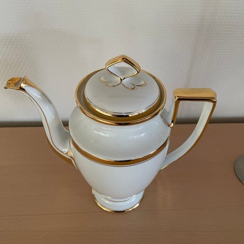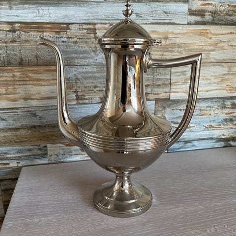 Kaffekande i rustfrit stål med låg og håndtag. Kanden har en rund form med en tud til at hælde kaffe ud. Designet er enkelt og funktionelt, velegnet til servering af kaffe.