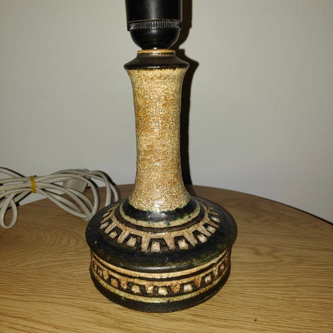 Bordlampe. Keramik af Jette Hellerøe. 41 cm høj uden skærm. Fod: 19 cm i diameter. Obs med lille afslag.