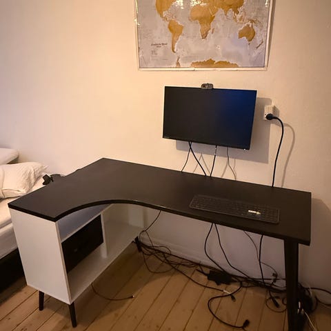 Der er tre skuffer i skrivebordet. Skinnerne på højre skuffe virker ikke længere, så den kan ikke køre ind og ud, men den kan stadig trækkes ud og skubbes på plads.