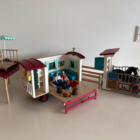 Schleich legetøj campingvogn med åbne sider, trapper, tagterrasse og tilbehør som stole, bord og små figurer.