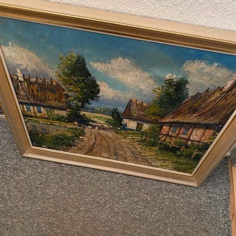 Oliemaleri af landskab med bindingsværkshus