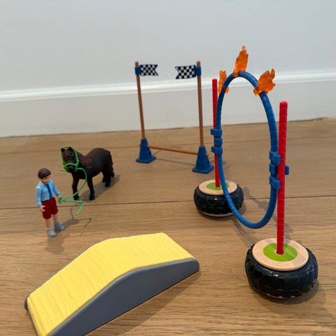 Schleich Farm World ridebane sæt med heste og figurer. Sættet indeholder en ridebane med hegn, flere hestefigurer, en rytter og forskellige rideudstyr som spring og bomme. Materialet er plast, og sættet er designet til leg og læring omkring heste og ridning.