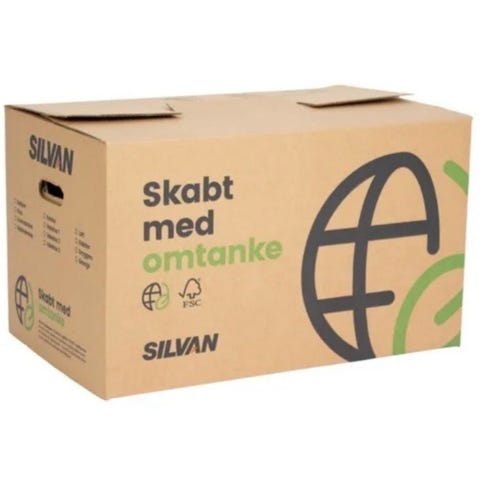 Silvan Skabsmøbel emballage i pap til beskyttelse og transport af skabe. Emballagen er i papmateriale og har tryk med Silvan-logo og tekst.