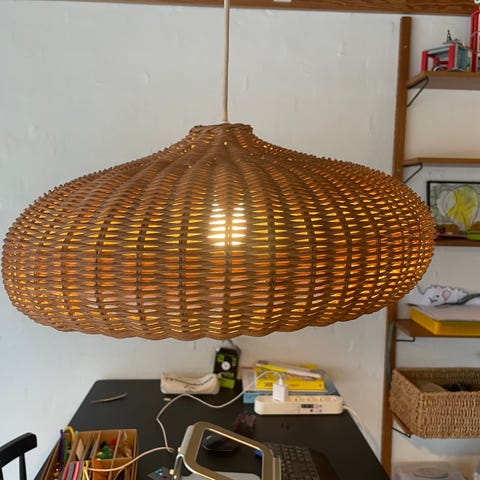 Retro fletlampe fra 70erne med opaliseret glaskuppel, som forhindrer blænding fra elpære og giver et godt dæmpet blødt lys ud i rummet. Bruger elpære med stor sokkel/E27. Diameter er 48 cm. Med 170 cm ledning.