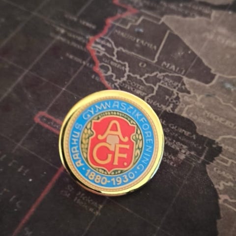 Rød badge med et farverigt logo på forsiden og et nålefæste på bagsiden til fastgørelse på tøj eller tasker.