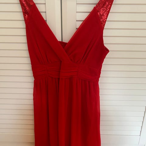 Rigtig flot rød kjole. Den er lavet af noget velour-agtigt strækstof. (Ved ikke hvad det hedder) Men det gør at kjolen falder pænt og passer til de fleste.