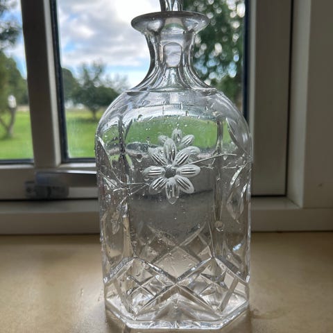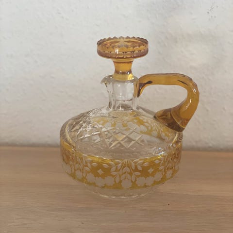 Glas karaffel med dekorative guldbånd. Karaffelen har en slank form med en bred bund og en smal hals med låg. Velegnet til opbevaring og servering af drikkevarer.