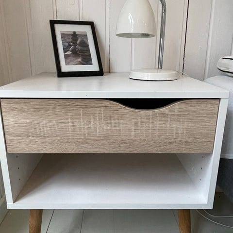 2 stk. Ilva væghængt natbord i træ med en skuffe. Mål: 42 cm bred, 32 cm dyb og 10 cm høj. Natbordet har en naturlig træfinish og metalbeslag til ophængning på væg. Det ene har lidt mærker på toppen. Sælges samlet. Ny pris 799 pr stk.