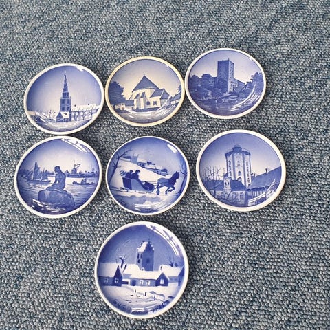 vægplatter i sæt af 3 stk. Platterne er ovale med blå dekorationer og tekster. Hver platte har et hul til ophængning. Mål ca. 15 cm i højden. Materiale er porcelæn.