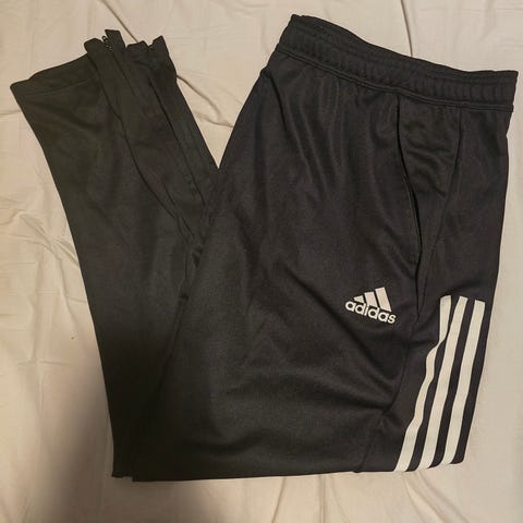Mørkeblå træningsbukser med hvidt Adidas logo på venstre ben og tre hvide striber ned langs siden af benene. Bukserne har elastik og snøre i taljen.