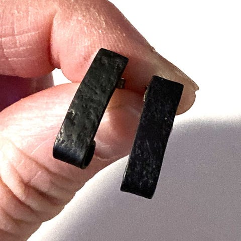 De er koksgrå med hvide riller og måler ca. 1,6 cm i diameter.