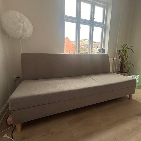 Sofa med beige stofbetræk, der inkluderer ryglænspuder med mønster og armlæn. Sofaen kan omdannes til en soveplads ved at folde den ud. Stoffet har en ribbet tekstur og mønstrede puder med dyremotiver.