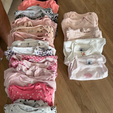Fuld tøjkasse med Helly Hansen jakke, overtræksbukser, vandtætte vanter, 2 huer, halsedisse, solhat, 4 nederdele, 16 kjoler, 3 heldragter, 19 par bukser, strømpebukser, 2 gamacher, 6 shorts, 3 trusser og 6 par strømper. I god stand, fylder en kasse på 40x40x30cm helt op. Kassen følger ikke med.