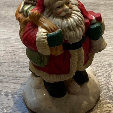 Julemand i rød dragt, hvid pelskant og sort bælte. Figuren har hvidt skæg og hår samt hvide støvler.