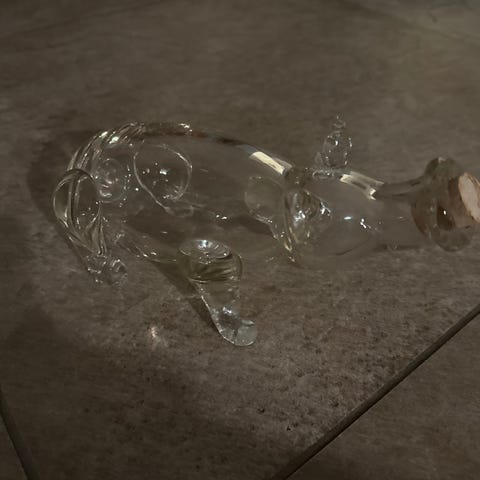 Glasfigur formet som en krokodille med en prop i glas. Figuren er gennemsigtig og har detaljerede træk, der illustrerer krokodillens form og struktur.
