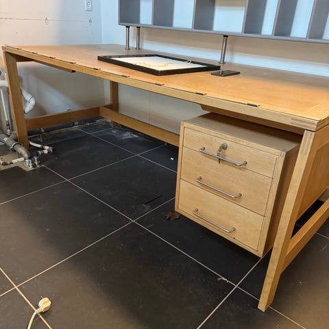 Skrivebord med stor bordplade . Der er 5 skuffer, 4 papirskuffer og 2 skuffer til skriveredskaber og andet