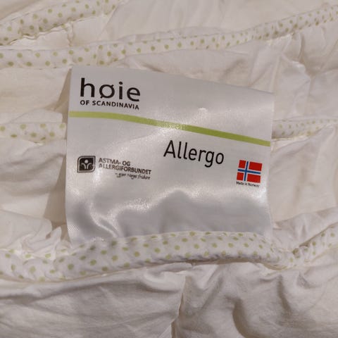 Høie Allergo allergivenlig dyne, 140cm x 100 cm, samt 7 tilhørende dyne- og pudebetræk. Alt virkelig pænt, nyvasket og fra røg-, parfume-, og dyrefrit hjem. Se også andre annoncer.