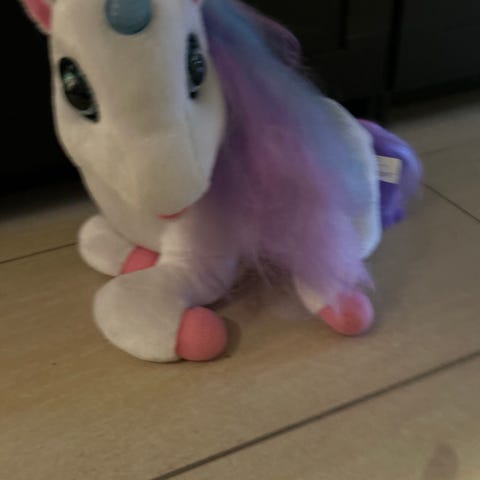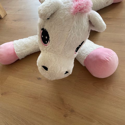 Magisk enhjørning med glitrende horn og bevægelige øjne, der fortæller eventyr. Er også blød som en bamse. Fast pris. Sender ikke. Kan hentes i Holte.