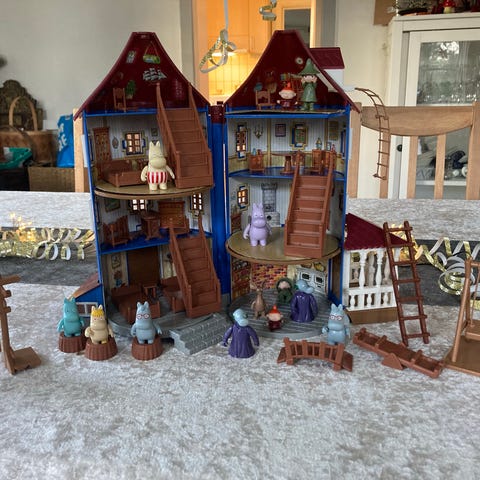 Moomin legehus der mangler et par vinduer, af inventar er der to stole, et bord og en seng