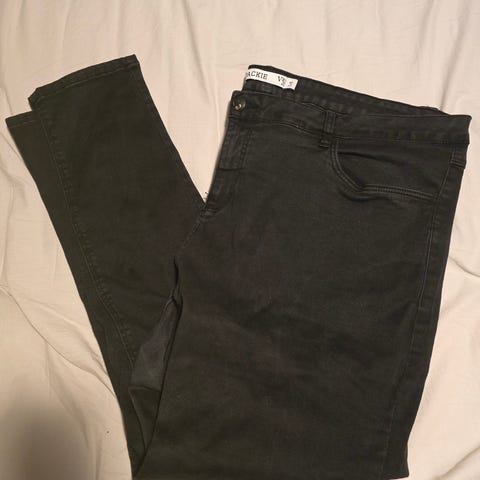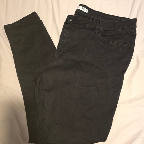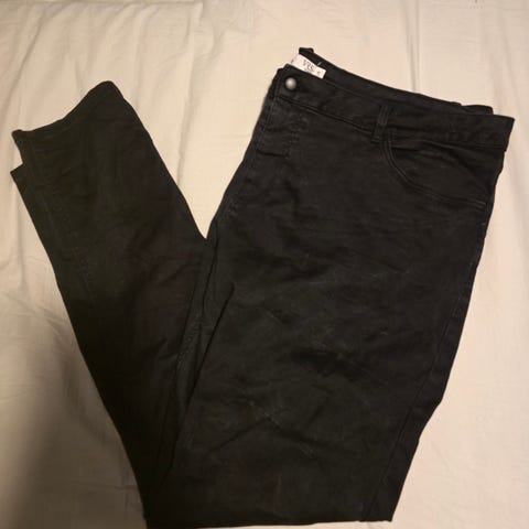 Sorte bukser med lommer bagpå og foran. Bukserne har en knap og lynlås.