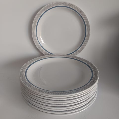Udgået model, farve grå. En dyb tallerken samt 1en middagstallerken har et lille hak i kanten - se billeder.