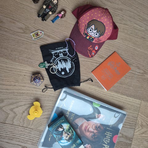 Originalt Harry Potter samleobjekt med Memory Book, tryllestav og glasflasker.