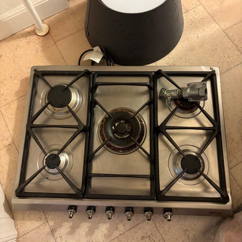 Smeg gaskogeplade med rustfri stål overflade. Komfuret har to gasblus og er designet til madlavning med gas.