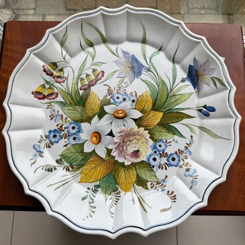 Spansk keramik når det er bedst. Stort fad fra de berømte værksteder i Granada. Håndmalet Fajafauza med en diameter på 46 cm i smukkeste stand, men et enkelt lille afslag på bagsiden, som ikke ses. Smukt på væg, bord eller gulv