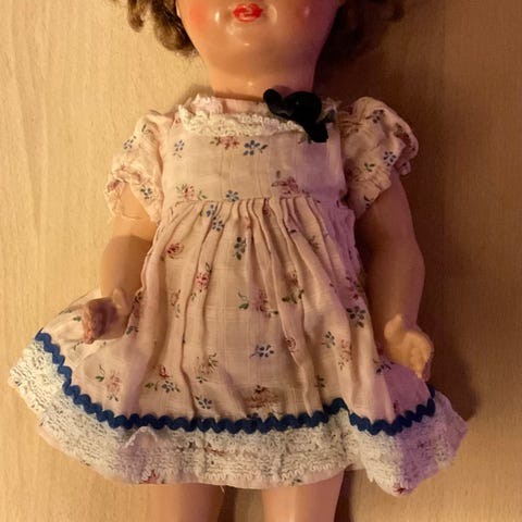 Meget fin antik dukke, ca 40 cm med fine, klare øjne og tunge. Lydboks, så man kan høre et lille piv, når man tager hende op.