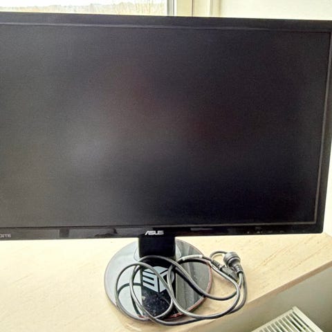 Asus 24" skærm med sort kabinet. Skærmen har en opløsning og størrelse på 24 tommer, egnet til almindelig brug som kontorarbejde, browsing og multimedieafspilning.