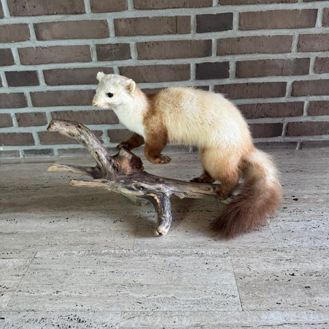 2 stk udstoppet husmår på hvrr sit træstykke.