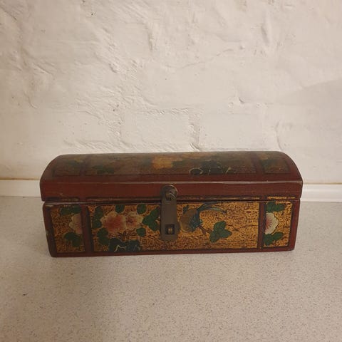 Lak æske m. indlæg af perlemor. Låget fremviser en scene med 3 kvindefigurer i traditionel klædedragt og et tehus i baggruden. Mål 20x12 cm, højde 5 cm. Spejl i æskens låg.