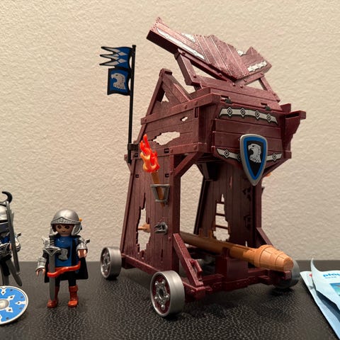 Høgeridderborg- næsten intakt. Mangler faldlem og bur, og en mast til flag. Men ellers intakt med de rigtige mænd, våben og tilbehør. Se også de to andre høgeridder annoncer hos mig; høvogn og kanonsæt. Alle tre sæt kan købes for en samlet pris på 450 kr. (50 kr i rabat)