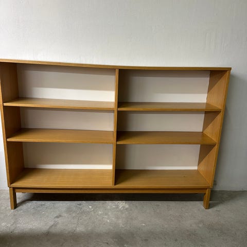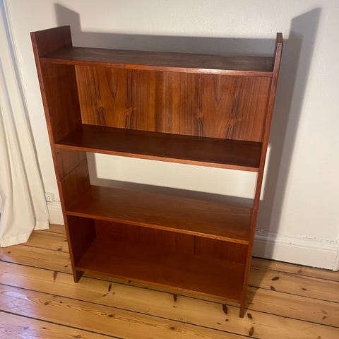 Lille reol i teaktræ. Den måler H69 B54 D23 (hylderne er d20 cm).
