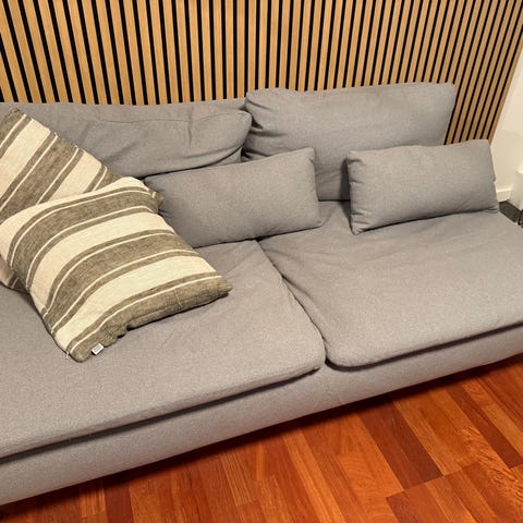 Sofa i gråt betræk. Ben i lyst træ. Købt i Ilva i juli 2018. Ingen slid, da den primært har været brugt som pyntesofa i gæsteværelse. Kvittering haves.