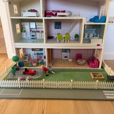 Lundby dukkehus med flere rum og tilhørende møbler, herunder stole, seng, komfur og skabe. Dukkehuset har forskellige rum med gulvbelægning og tapet, egnet til leg og indretning.