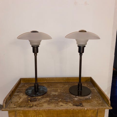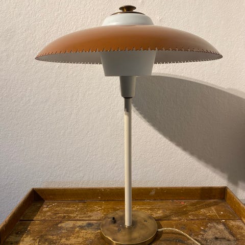 Utrolig flot gammel Lyfa bordlampe i bruneret messing med skærme i rødbemalet messing