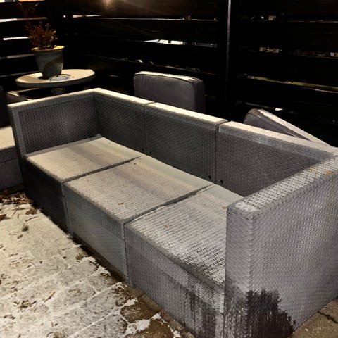 Sort havemøbelsæt i flet med sofa, stol og bord