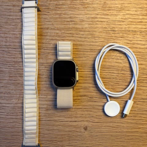 Der medfølger oplader kabel samt original orange Alpine Loop rem.