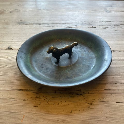 Flot fad med fire opdelinger og hund i midten