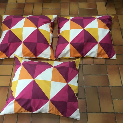 5 stk. IKEA Lusy Blom puder. Denne kollektion er en udgået, vintage IKEA-vare, der allerede er et samlerobjekt, som formentlig vil stige i værdi. Puderne har et farverigt, retro-inspireret blomster- og cirkelmønster på en mørkeblå eller marineblå baggrund. Pudebetrækket er lavet af bomuld, og de er miljøvenligt produceret bl.a. med fyld, som er overskud/rester (der ellers skulle have været smidt ud) fra Ikeas produktion af tæpper mv. Puderne er i god stand fra ikkerygerhjem uden husdyr og er selvfølgelig uden huller eller pletter. Der må dog påregnes et vist farvetab. Prisen er pr.stk. ved køb af alle 5 stk. Sælges også enkeltvis til 75,- pr. stk. Yderligere rabat gives gerne ved køb af flere af mine annoncer. Kan sendes eller afhentes i Nørresundby.