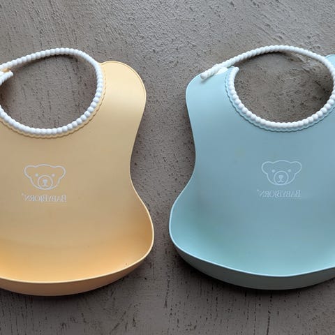 BabyBjörn hagesmæk i pink med opsamler, designet til at fange mad og beskytte tøj under måltider.