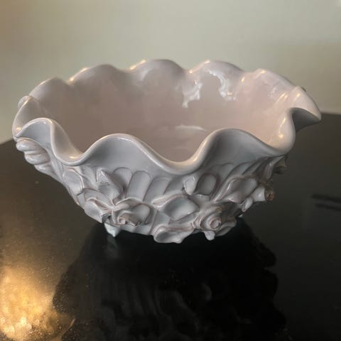 keramik skål med håndmalet blomsterdekor i flere farver. Skålen har en unik form og er egnet til dekorative formål eller servering. Materialet er keramik, og designet indeholder detaljerede blomster og blade. Signeret Torben