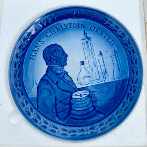 Royal Copenhagen Bicentennial Plate No. 3 porcelænstallerken i blå farve. Tallerkenen har motiv af Hans Christian Ørsted og er fremstillet i porcelæn. Den er en del af en samlerserie og leveres i original æske.