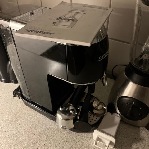 Gastroback espressomaskine i sort farve. Maskinen har en kompakt størrelse og er designet til at brygge espresso. Den har en metal- og plastkonstruktion og er egnet til hjemmebrug.