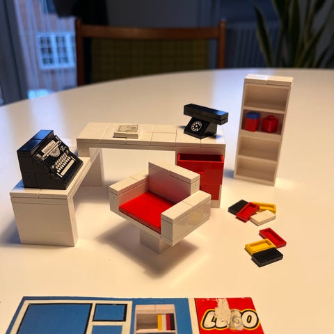 Lego sæt ‘hjemmegående’ Table and Chairs, blå, med hjerter. Sætter har nr. 275-1 og er udgivet i 1974.