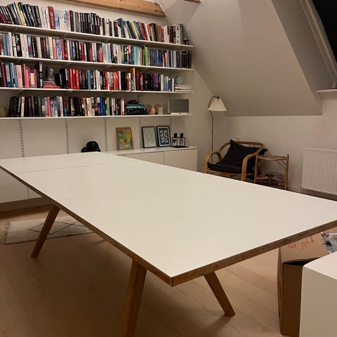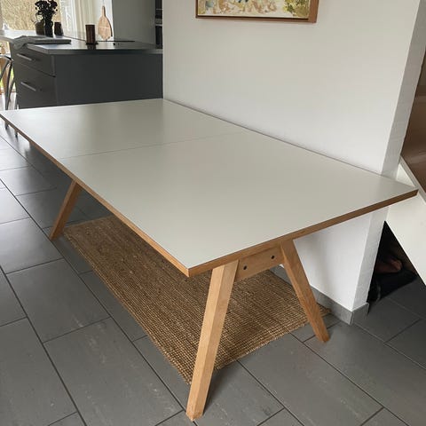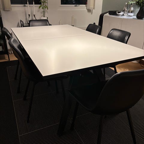 Hvid Nanolaminatbordplade med sort kant og sortbejdset stel. Ved fuld størrelse kan der sidde 12 personer. Ingen synlige skrammer. 2 indbyggede tillægsplader gør det super let at udvide bordet.