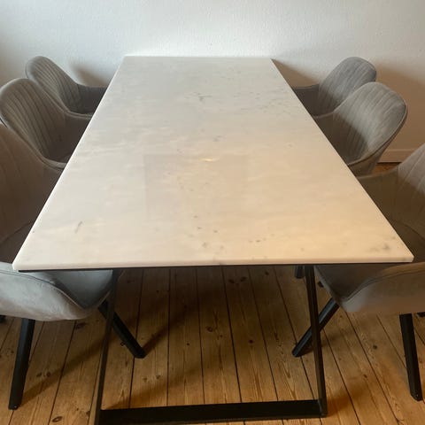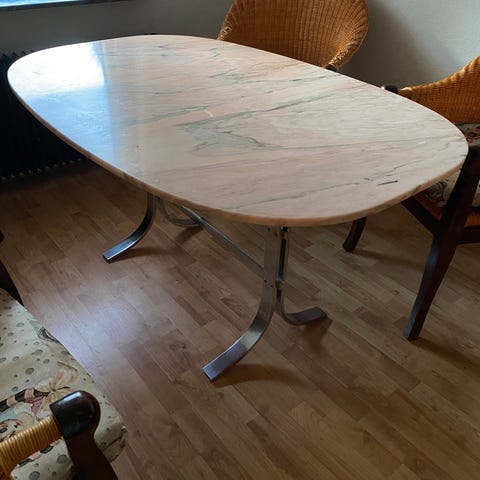 Meget flot spisebord i ægte marmor. Bordet er fra 1960 og har haft adskillige ejere igennem tiden og er blevet passet rigtig godt på siden det står som det gør. Bordet blev overfladebehandlet for 3-4 år siden da vi købte det. Vi flytter og har ikke plads til det i vores nye hus. Bemærk at bordet er meget tung og vil kræve at I kommer mindst 2 personer. Vi bor på anden sal - dog med bredde trapper så det er forholdsvis let at bære det ned. Metalbenene kan let adskilles.